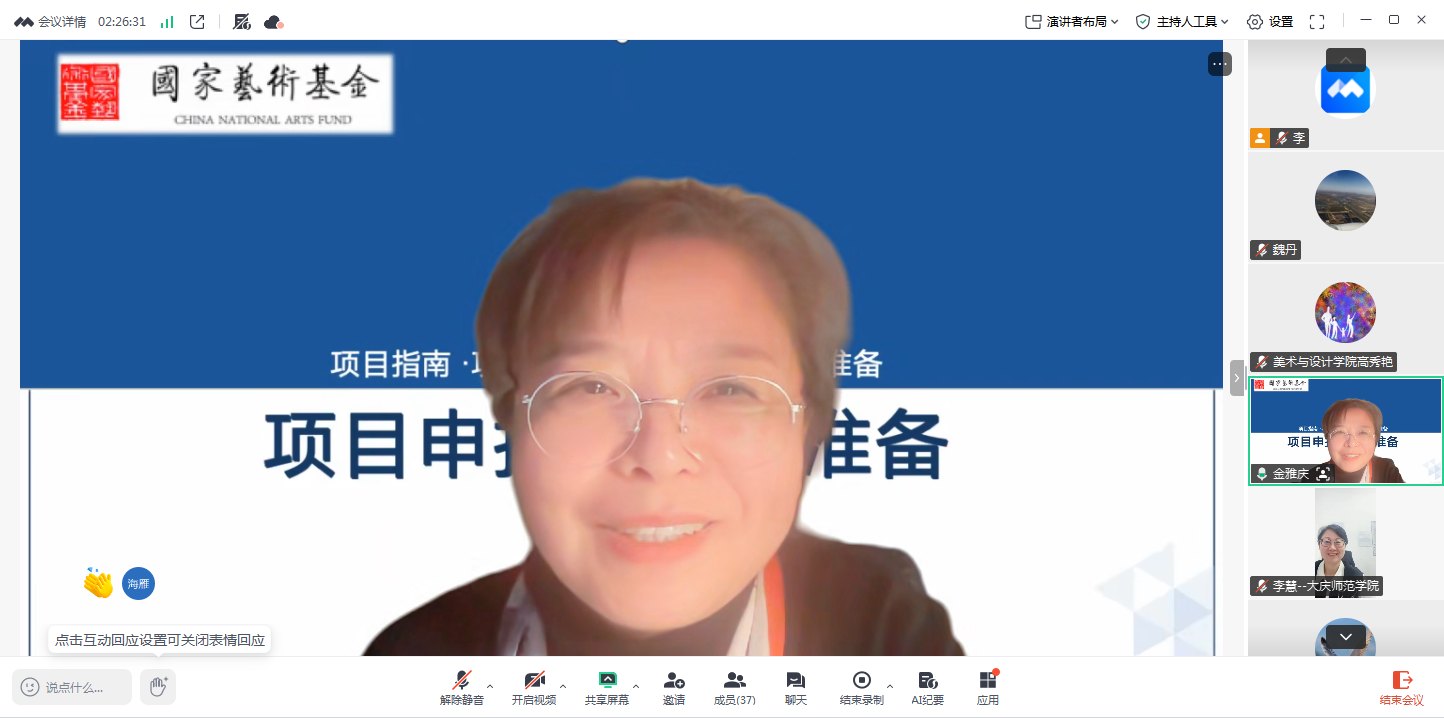 为提升学院师生项目申报能力,规范材料准备流程,12月9日下午,美术与设计学院通过线上平台成功举办学术讲座,本次讲座特别邀请吉林建筑大学金雅庆教授主讲,主题为《项目申报与材料准备》,学院各专业教师共计40余人参与此次线上学习。