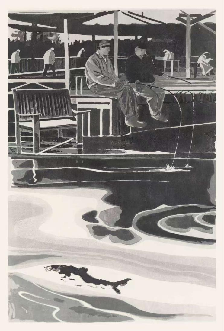 青年教师王迪长期深耕版画创作与教学研究,尤其在水印版画领域有着深入探索,始终坚持以时代为创作底色,在传承版画传统技艺的基础上,积极探索题材、形式与语言的创新表达。此次入选的水印版画作品《渔事钓客》,紧扣“镌刻时代” 的展览主题,以北方日常水系场景为创作题材,画面中粼粼水波与错落的岸边景致相映成趣,钓者静坐的姿态悠然自得,既还原了生活的质朴本真,又暗含对现代社会人们追寻宁静心境的思考。在艺术手法上,作品充分发挥水印版画的材质优势,以淡墨印染营造朦胧的意境,用细腻的线条勾勒人物与场景的细节,色彩上以清雅的墨色为主调,搭配局部冷色调点缀,既展现出水印版画特有的温润质感与层次美感,又赋予画面鲜活的生命力,将个人艺术思考与时代精神相融合,传递出对现实生活的观察与对文化传承的坚守,充分体现了当代青年艺术家的责任与担当。