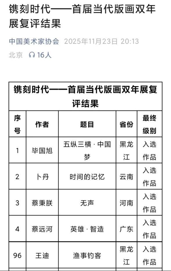 11月24日,由中国美术家协会、黑龙江省文学艺术界联合会联合主办,《美术》杂志社、黑龙江省美术家协会承办的“镌刻时代——首届当代版画双年展”入选名单正式公布,美术与设计学院青年教师王迪的版画作品凭借鲜明的时代特色、精湛的艺术技法与深刻的思想内涵成功入选,彰显了我院青年教师在专业创作领域的扎实功底与创新活力。
