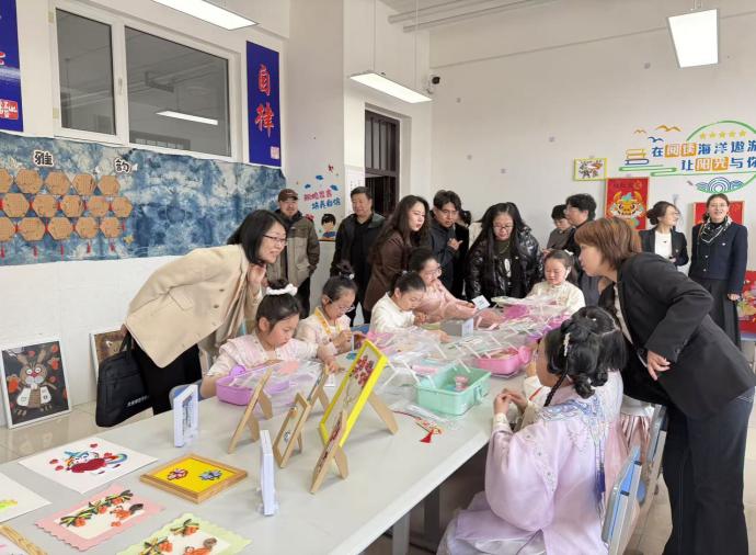 活动伊始,学院领导与师生参观了月亮湾小学校园美育文化建设,观摩学校宣传片、风筝主题美术作品展、红色美育展区、特色文创作品及师生书法现场创作,全面感受该校美育办学成果及以传统文化育人的鲜明特色。
